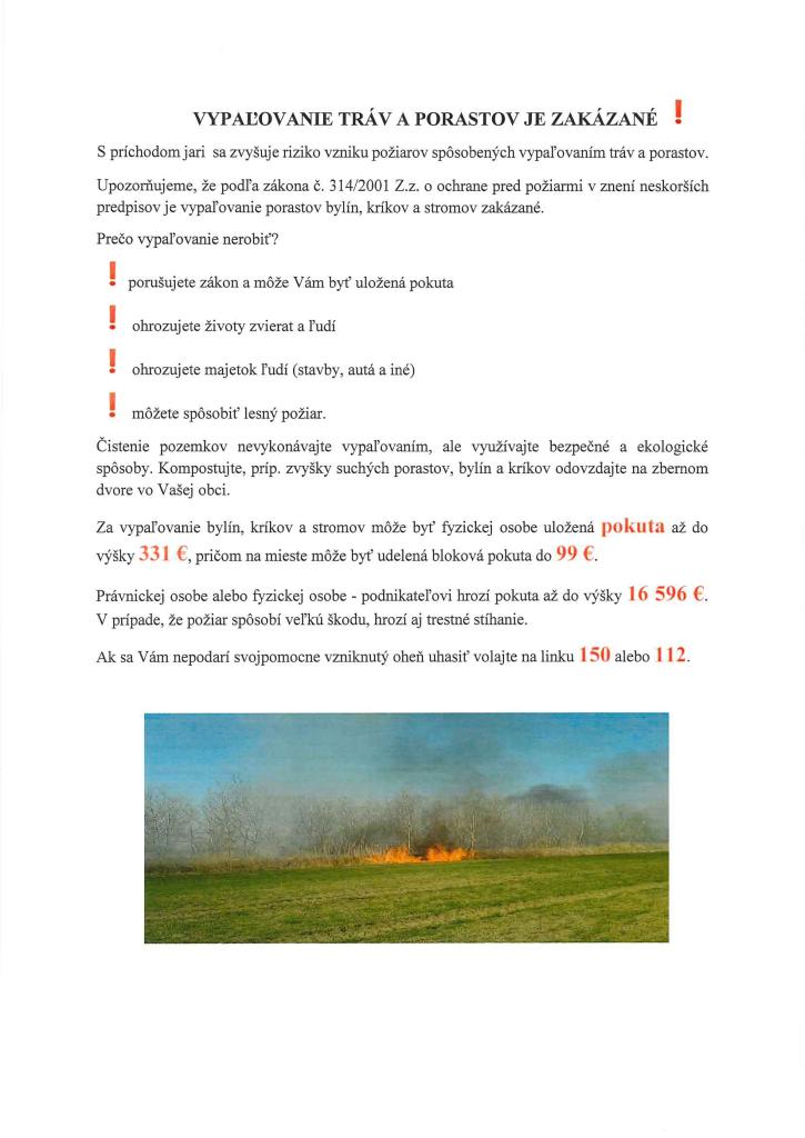 A száraz tarló és növényzet égetése évente ismétlődő tűzveszélyt jelent, ezért felhívják a lakosok figyelmét, hogy tartsák be a tűzvédelmi törvényt, amely szerint tilos a növényzet, a bokrok és fák elégetése.