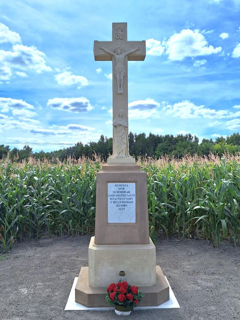(preklad: Opravené v roku 1946 na počesť toho, že naša obec neutrpela počas druhej svetovej vojny žiadny zásah.)