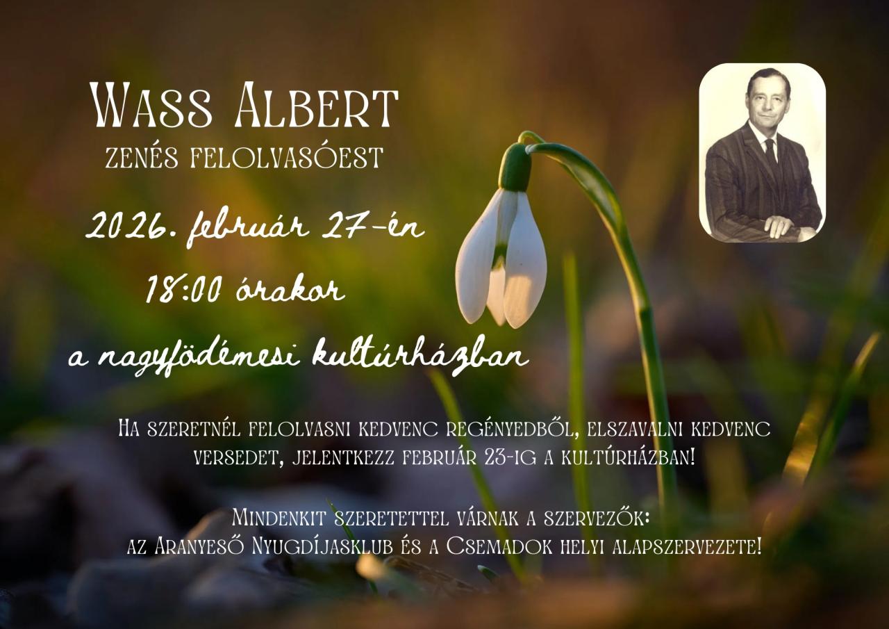 Miestna organizácia Csemadoku, Miestne kultúrne stredisko a Klub dôchodcov Zlatý dážď srdečne pozýva milovníkov literatúry na hudobno-literárny večer Alberta Wassa, ktorý sa uskutoční dňa 27. februára 2026 (v piatok) o 18.00 hodine v kultúrnom dome. Vstup je bezplatný. O občerstvenie, príjemnú zábavu a krásny umelecký zážitok je postarané.